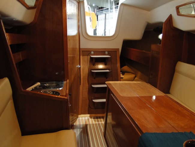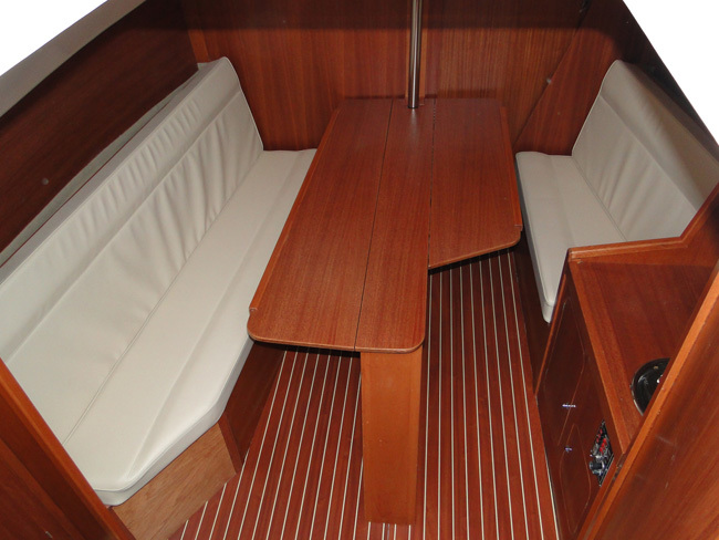 Annehmlichkeiten wie eine abgetrennte Vorschiffs-Kabine und eine Stehhöhe am Niedergang von 195 cm sind Kennzeichen dieser Kajüt-Yacht.